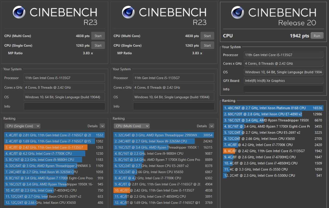 Процессор Intel Core i5-1135G7 ожидаемо проиграл старшему брату Intel Core i7-1165G7 в синтетических тестах. При этом, если разрыв в производительности на ядро был около 20%, то при мультиядерной нагрузке чипы показали практически одинаковый результат.