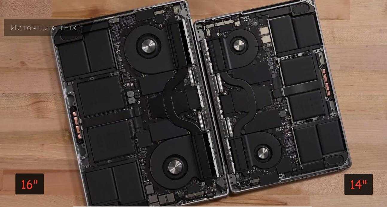 Разборка MacBook Pro 16″ и 14″ показала, что устройства предельно идентичны, только разные масштабы. Почти идентичные системы охлаждения. Единственный нюанс — вентиляторы в более компактной версии ноутбука меньше, а значит вращаются быстрее — до 6200 об/мин (в версии на 16″ вентиляторы работают до 5800 об/мин.)