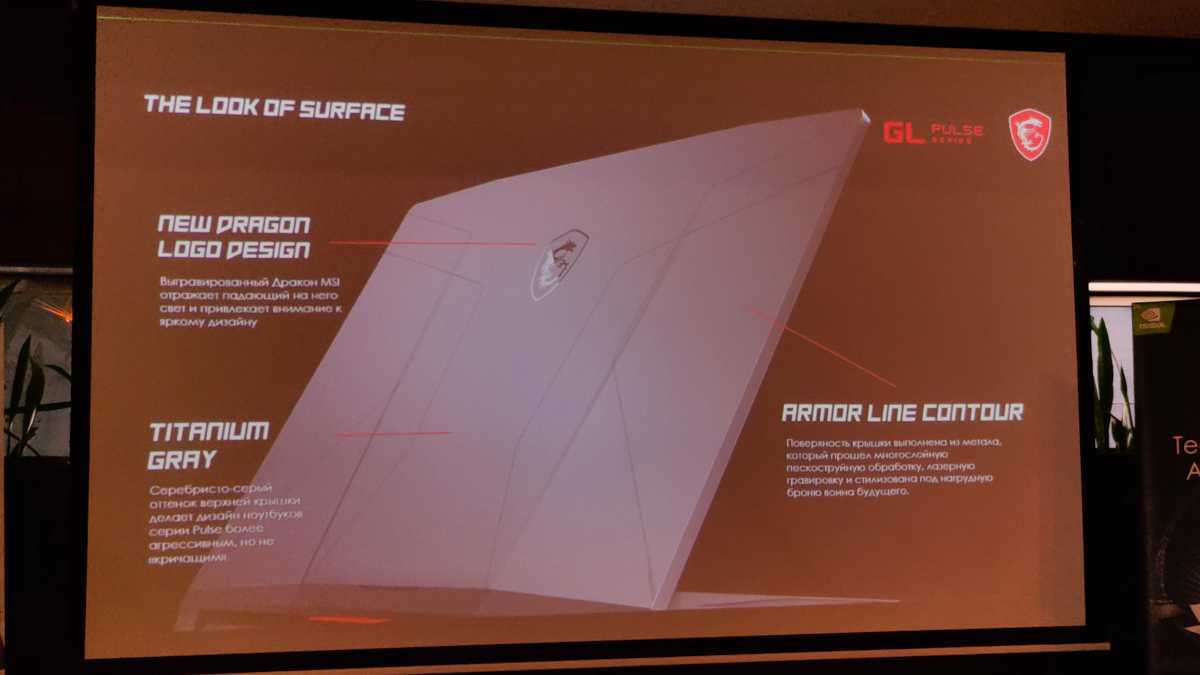 Чтобы удержать такой дисплей потребовались большие петли, которые слегка выпирают из крышки. Сама же поверхность выполнена в серо-голубоватых тонах с обработкой под титан. Украшает крышку серебряный логотип MSI без подсветки.