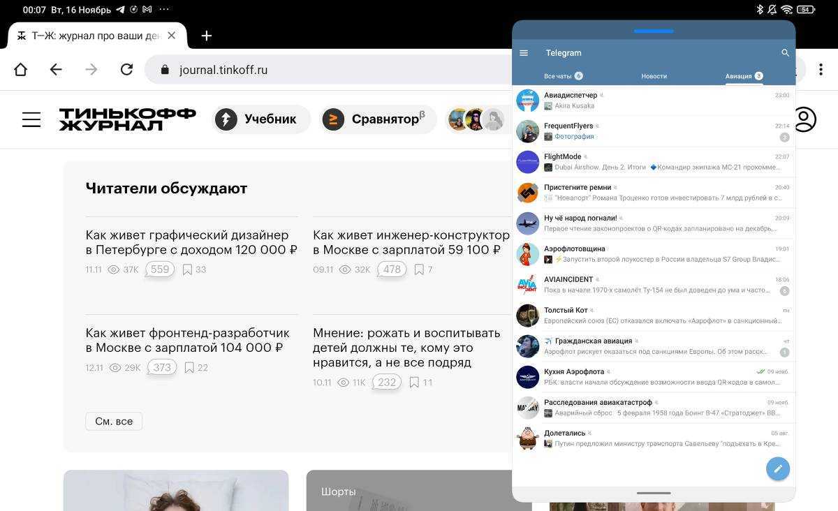 Большинство приложений можно запускать в виде небольших плавающих окошек. Удобно — можно читать статьи в браузере и следить за обновлением каналов в «Телеграме». Классическое разделение экрана на две части для запуска разных программ тоже есть