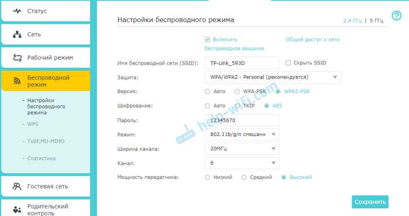 Режим сети – ставим b/g/n (смешанный), но если там есть возможность, то попробуйте выбрать «Только 802.11n». Канал можно попробовать поставить какой-то статический (например 6, но если не поможет — верните на Авто), а ширину канала ставим 20MHz. На этой же странице, или на странице с настройками пароля установите тип защиты сети WPA2-PSK (WPA/WPA2-Personal) и шифрование AES.